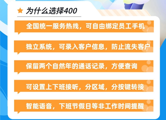 400電話轉接人工服務,自動播報客服人員工號,體現管理規范有序的大企業服務形象。